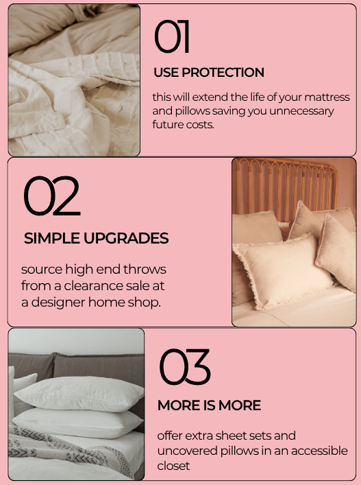 To protect my guests as well as my assets, I invest in hypoallergenic mattress and pillow covers. It’s important to not only provide these, but to make sure to remove and wash frequently. No need to break the bank either. I opted for the popular brand Allerease. Even something as cost effective as this can reduce allergens that could disrupt a good night’s sleep, prevent unwanted pests, and extend the life of your mattress or pillowcase.